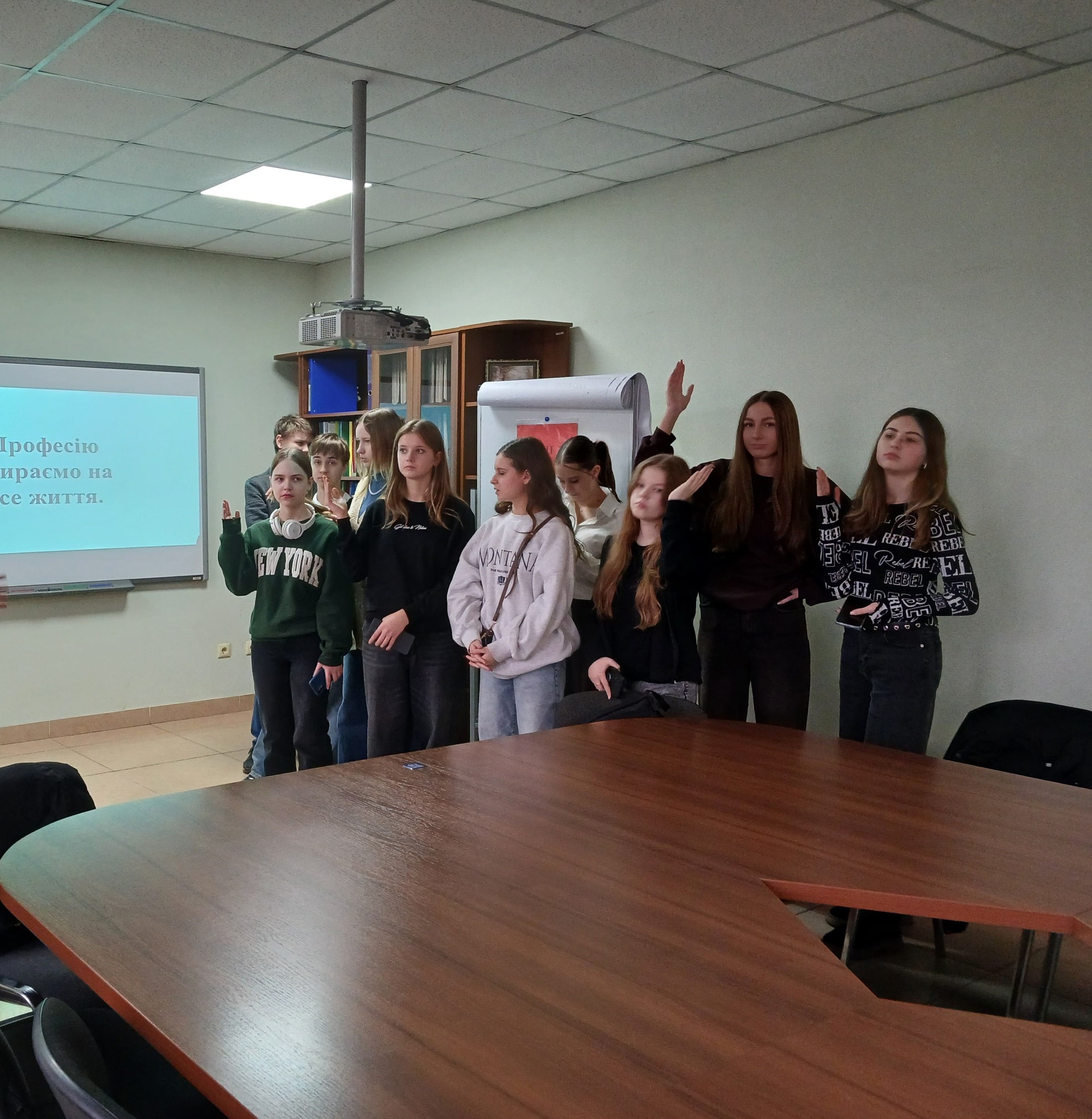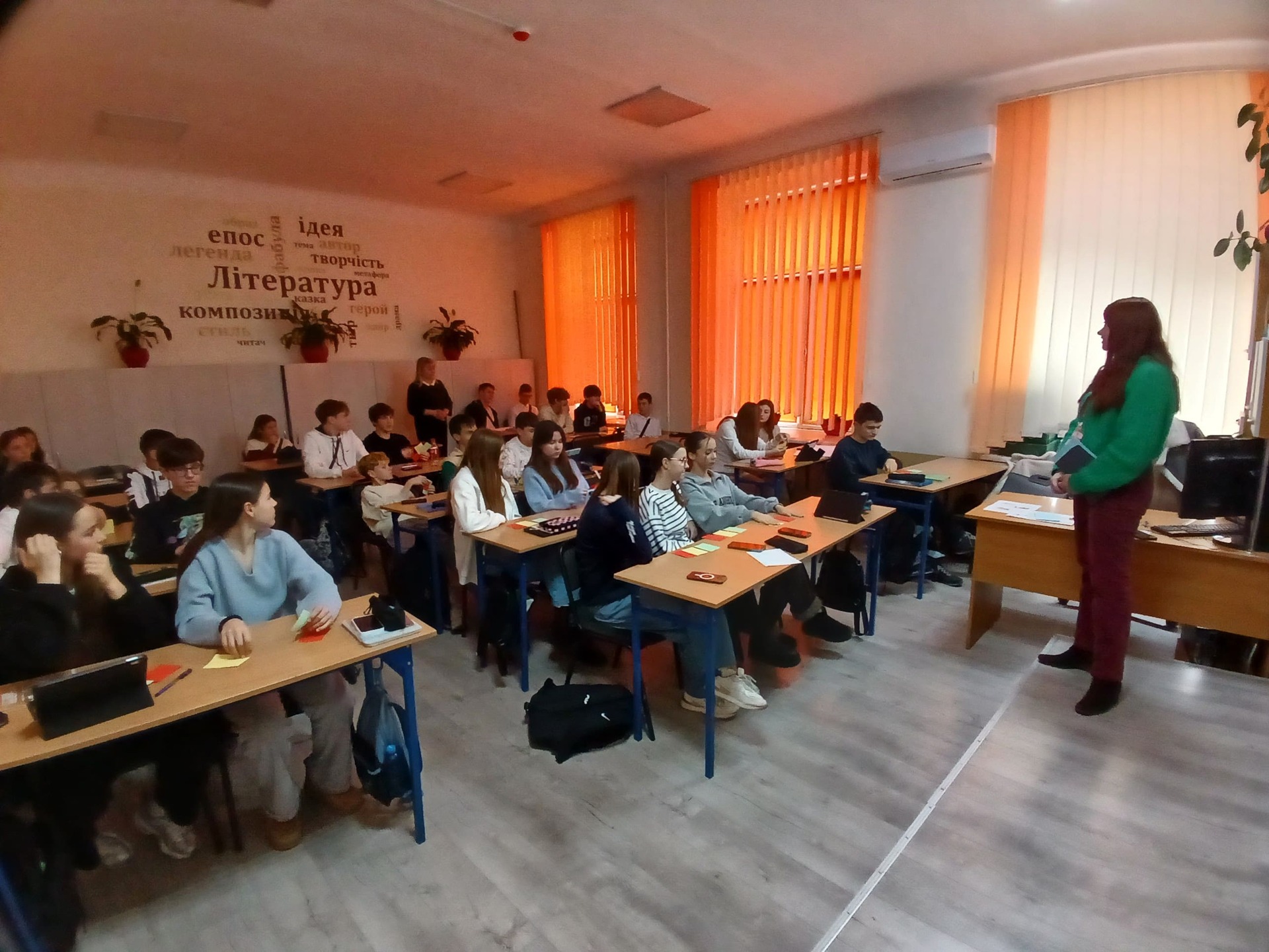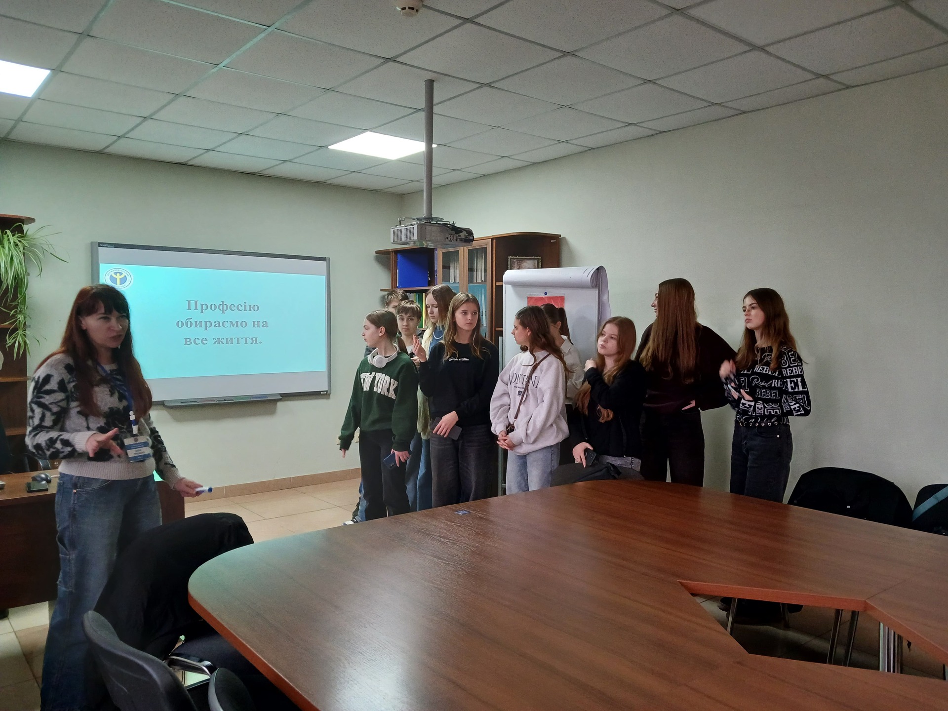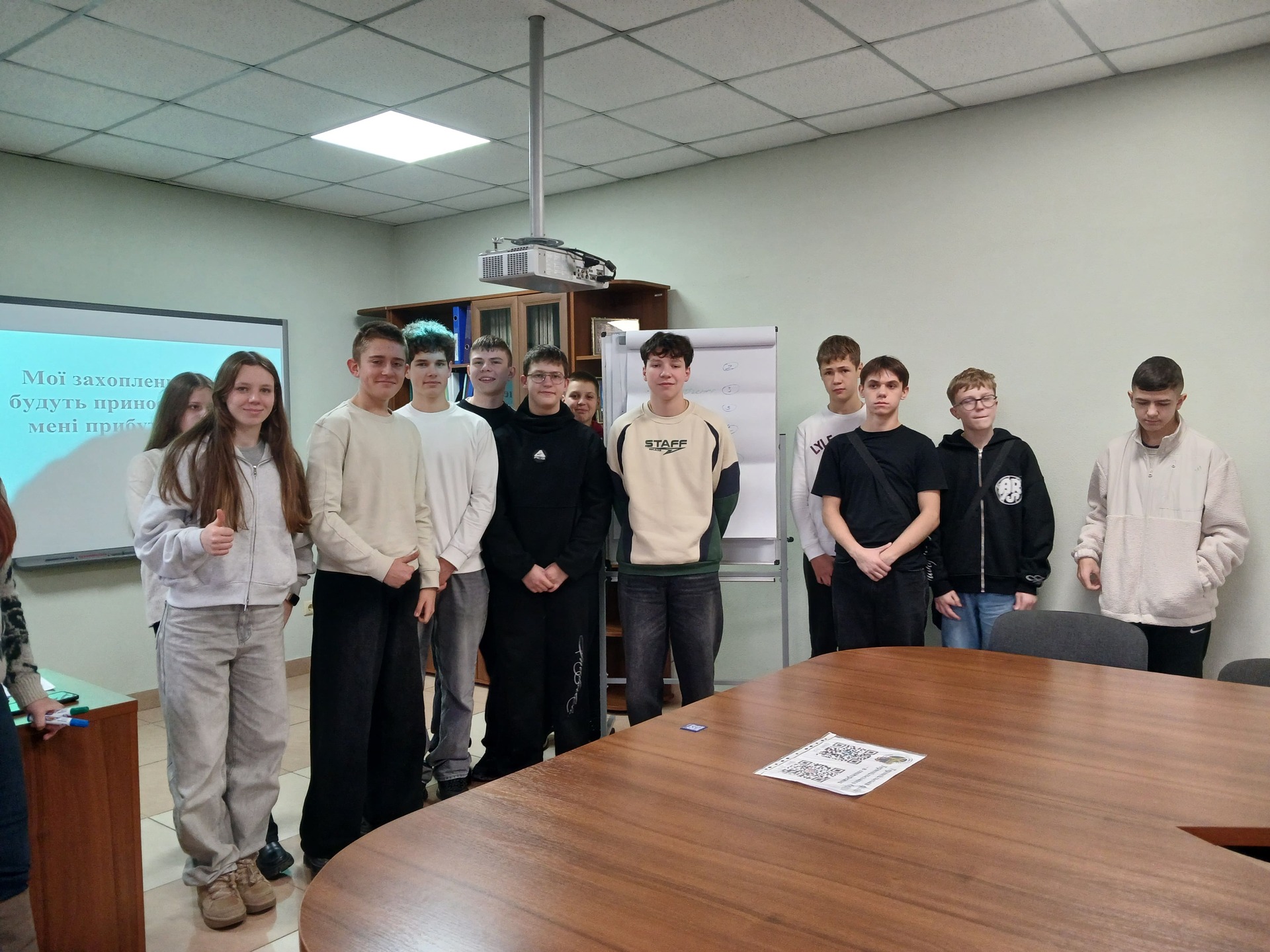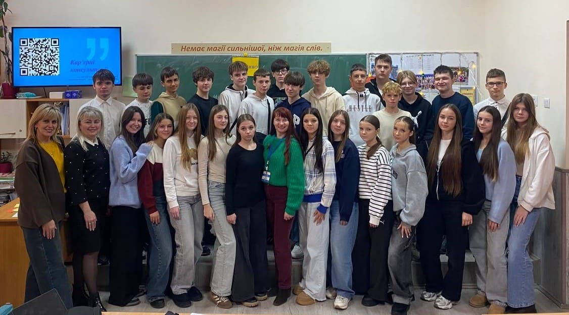 Аліна Грицаєнко, завідувачка сектору профорієнтації та психологічної підтримки, провела профорієнтаційні заняття на тему «Світ професій. Особливості вибору». Під час занять дев’ятикласники ознайомилися з різноманіттям сучасних професій, обговорили тенденції ринку праці та навчилися визначати власні інтереси й здібності, які можуть впливати на майбутній вибір. Особливу увагу було приділено важливості усвідомленого вибору професії, врахуванню власних цінностей, рис характеру та можливостей подальшого розвитку.
